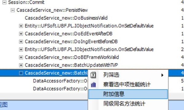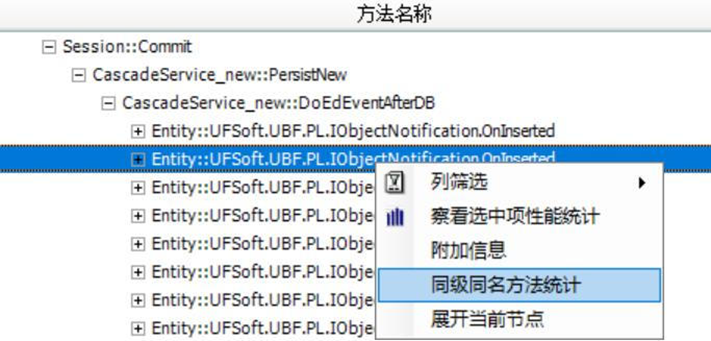 查看耗时方法中那一步耗时需要再次展开,如图可以看到 Session.Commit 耗时, commit 要走 BE,调用过程为 OnSetDefaultValue-OnValidate-OnInserting/OnUpdating/ OnDeleting